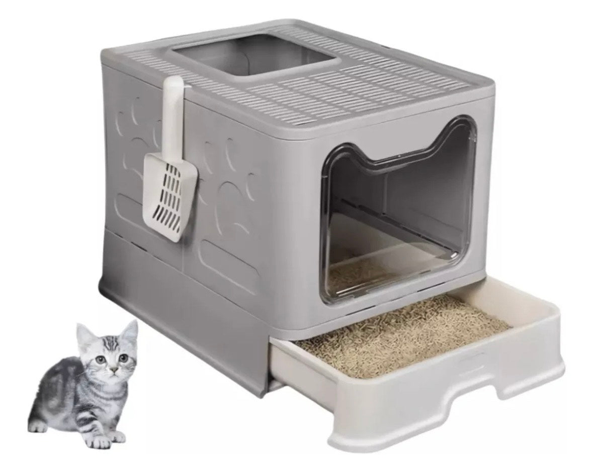 La caja sanitaria para gatos tiene un diseño con pequeños agujeros en la parte superior que permiten que la arena caiga en la caja de arena, reduciendo la cantidad de arena que se dispersa. La tapa acanalada ayuda a eliminar las partículas de arena de las patas del gato. La puerta frontal de cierre automático reduce la emisión de olores.