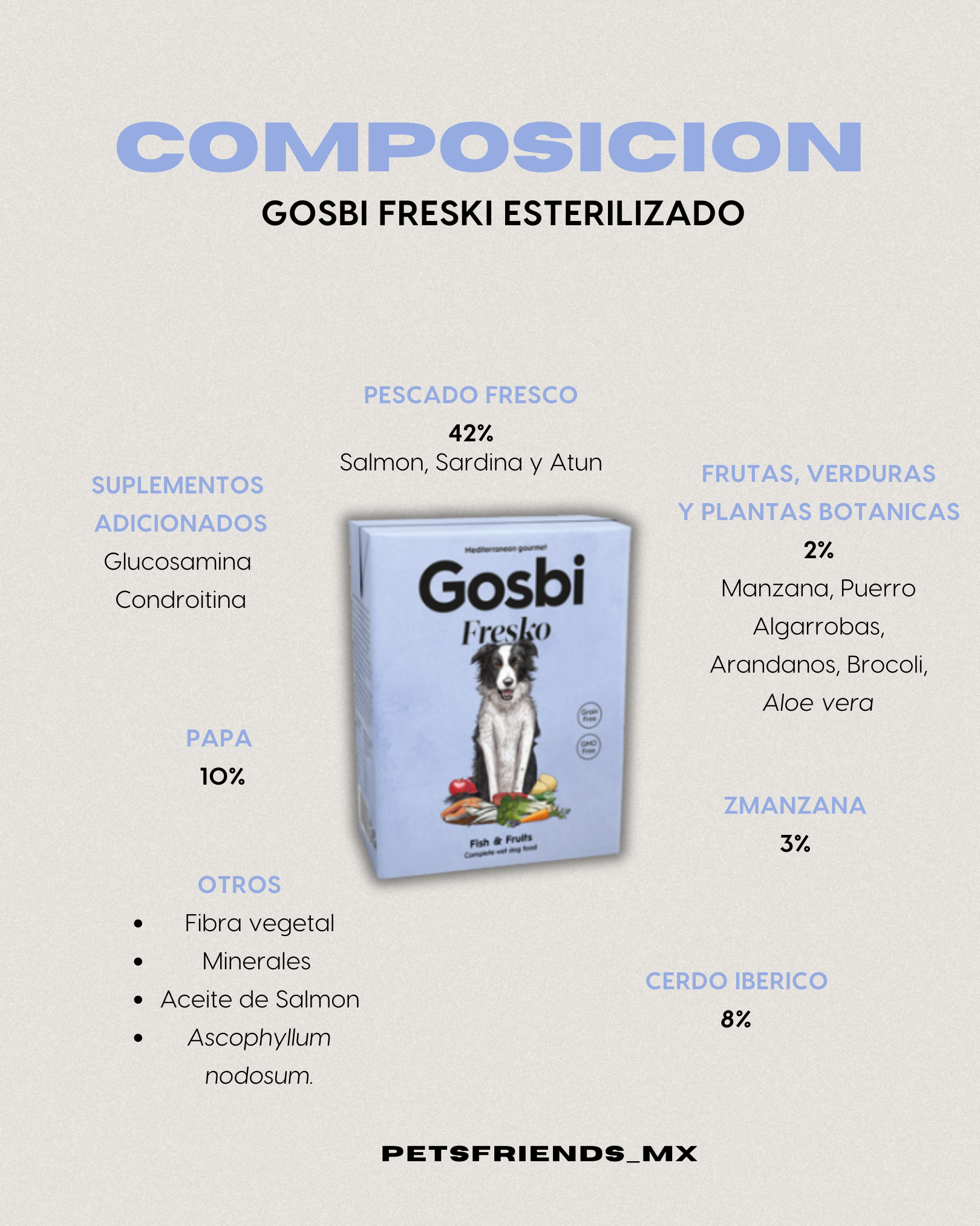 Los alimentos húmedos completos GOSBI FRESKO permiten a nuestras mascotas disponer de una alimentación natural de máxima calidad: elaborados con carne, pescado, fruta y verduras cocinadas en su propio caldo que consiguen que su apetencia sea espectacular.