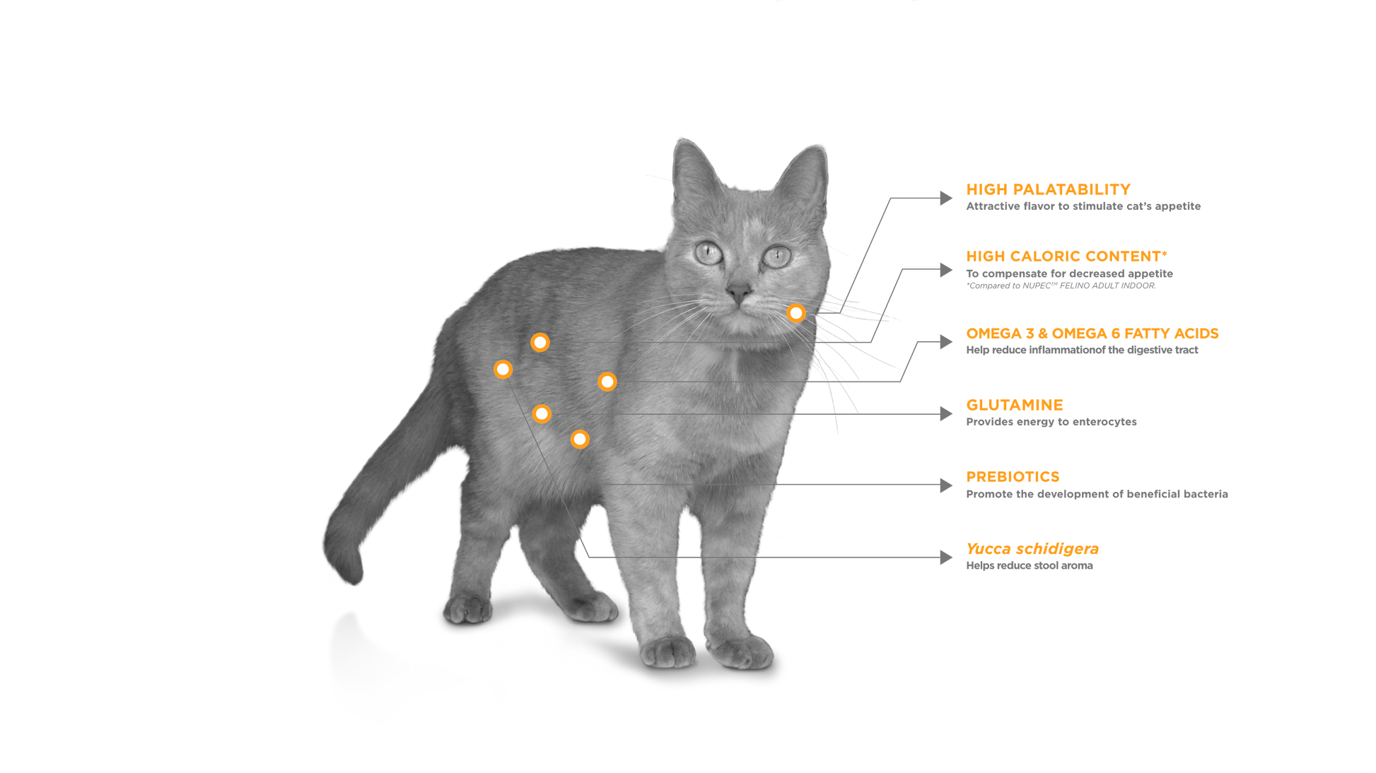 NUPEC FELINO DIGESTIVE HEALTH es un alimento especializado auxiliar en el manejo integral de la salud digestiva de los felinos. La adición de prebióticos favorece la salud intestinal, ya que promueve el desarrollo de bacterias benéficas. Agregamos GLUTAMINA, un aminoácido que provee de energía a los enterocitos, favoreciendo así, la regeneración de la pared intestinal. La calidad de los ingredientes, las proteínas altamente digestibles, así como el balance de fibras hacen de NUPEC FELINO DIGESTIVE HEALTH un alimento que promueve la salud intestinal de tu gato.
