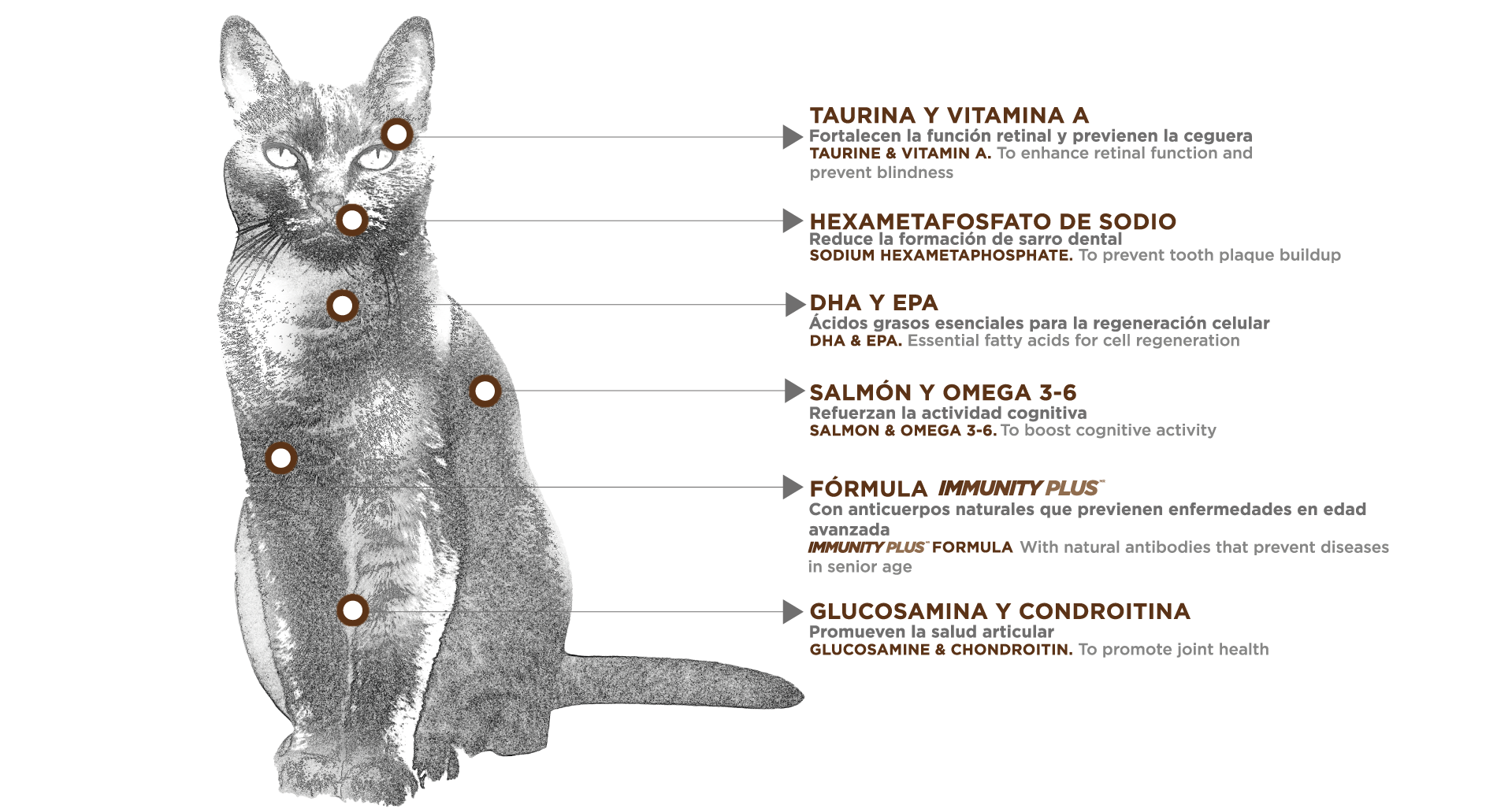 En NUPEC estamos conscientes de que el metabolismo de un felino senior requiere de una nutrición formulada específicamente para cubrir las necesidades propias de un adulto de etapa madura. Por ello hemos formulado una nutrición especializada con un balance de ingredientes que previene el envejecimiento celular, manteniéndolo activo y sano por más tiempo.